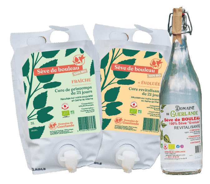 La sève de bouleau de Guerlande est récoltée sur notre propriété en Seine-et-Marne (77). Elle est composée à 100% de sève de bouleau non-pasteurisée et sans conservateur.